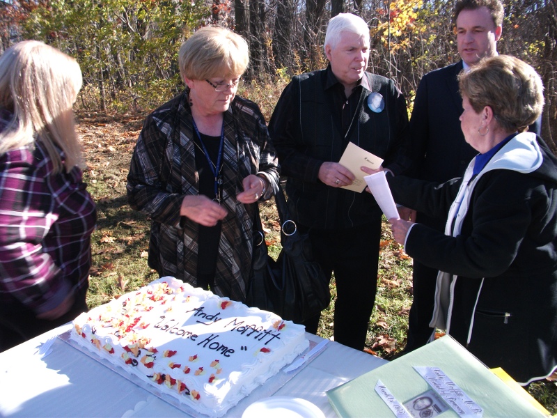 Speakers included Mr. Bob Runciman (MPP for Leeds-Grenville and Ontario Minister of Public Safety and Security), Mayor Ben DeKamp (Brockville, Ontario), Father Timothy Harrison (St. John Bosco Church, Brockville, Ontario), Detective Dale Hayes (Ottawa Police Department) and Paulette Moffitt (Andy's mother).