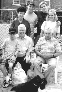 The Moffitt family portrait, posted on the Andy Moffitt memorial Web site, features, standing at back, left to right: Andy's mother Paulette, Andy with baseball cap, brother Rod, and Rod's fiancee Karen Visser. Seated at front, left to right: brother Michael, 11, father Rod Sr., and grandfather Adrien Beriault. Mr. Beriault's dog Elby, is at front.